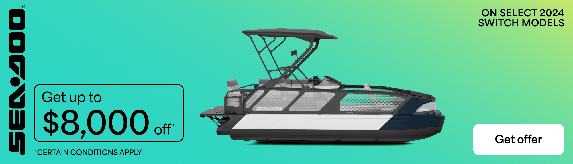 Rebates up to $8,000 or financing starting at 0% for 36 months on select 2024 Sea-Doo Switch models